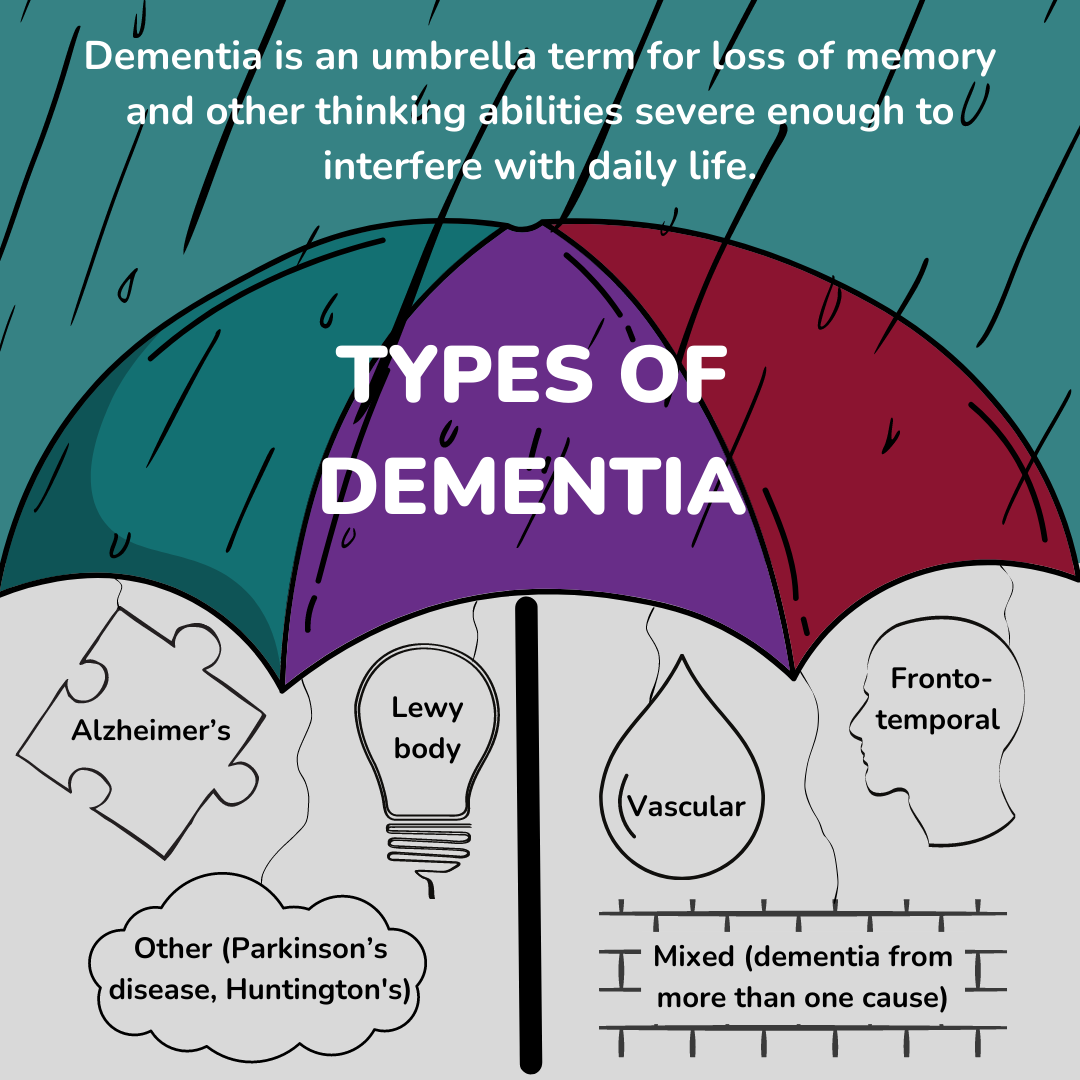 Dementia is an umbrella term for loss of memory and other thinking abilities severe enough to interfere with daily life.