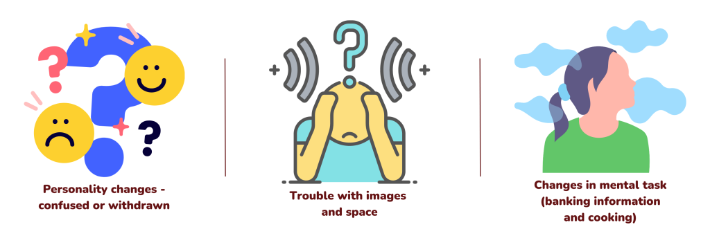 - Language- may forget simple words or use the wrong words
